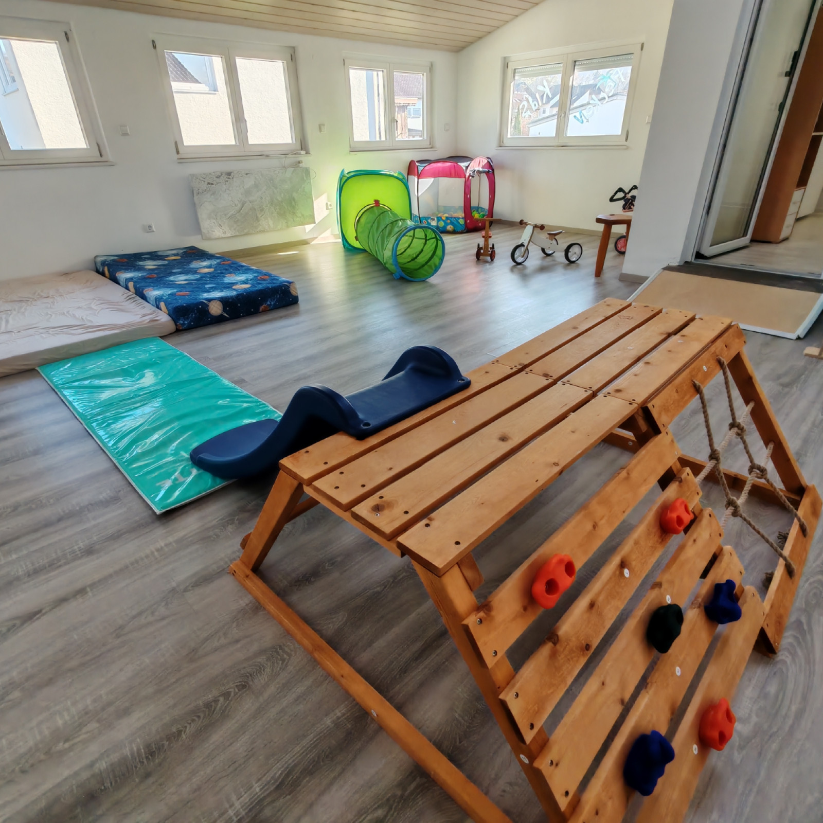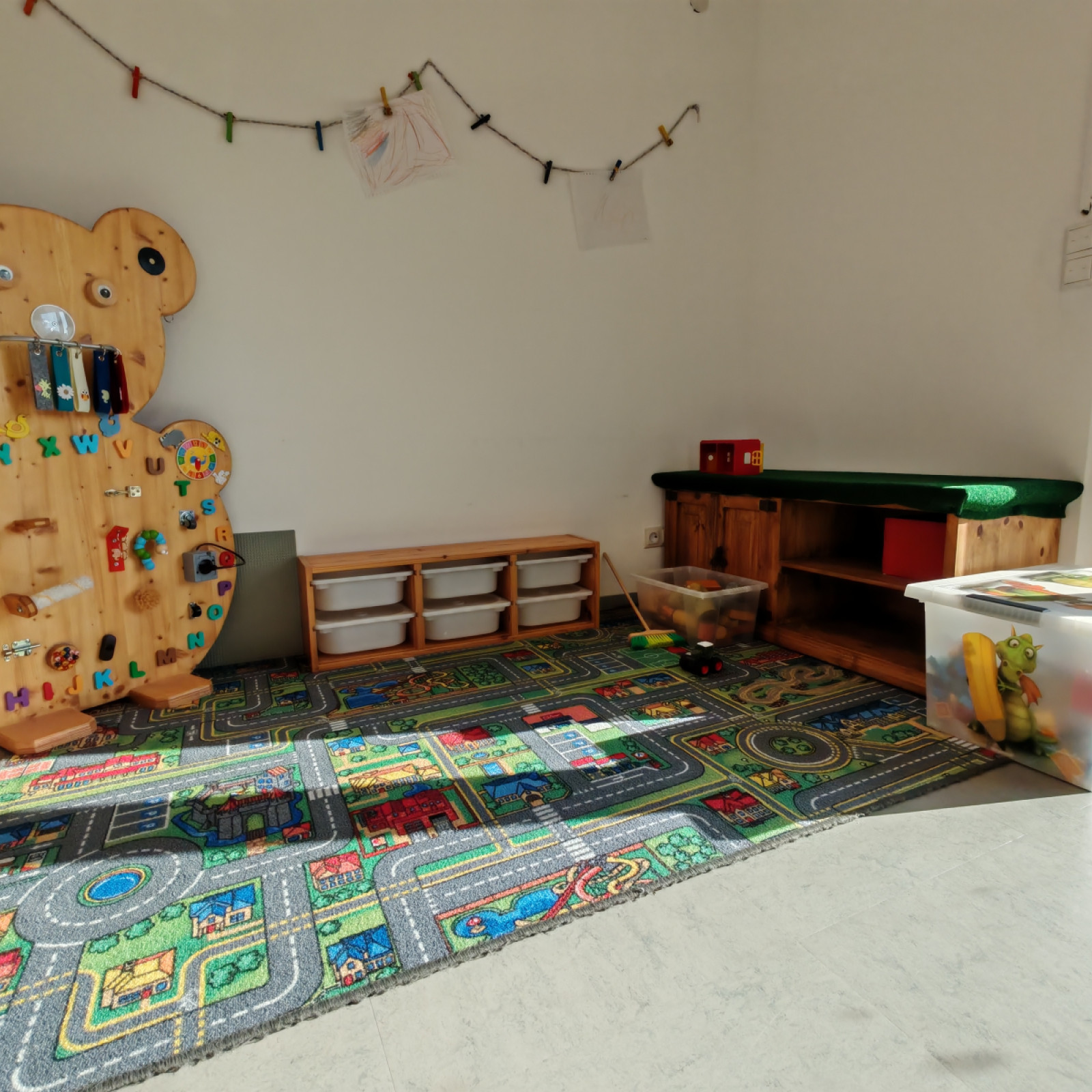 Kinder haben besondere Bedürfnisse an die Einrichtung: in unserem Badezimmer gibt es einen Wickeltisch, bei den Waschbecken steht eine Erhöhung, damit auch die Kleinen an den Wasserhahn kommen und es gibt eine separate Toilette. Für den Mittagsschlaf oder um sich auszuruhen gibt es zwei Schlafbereiche mit einem eigenen Matratzenbett für jedes Kind. Die Küche ist besonders wichtig: hier bereiten wir – auch oft gemeinsam mit den Kindern – die Mahlzeiten zu und lassen es uns zusammen am großen Tisch im Essbereich schmecken. In den Räumen gibt es verschiedene Bereiche zum Basteln, Malen oder Spielen. Wir haben eine großen Turnraum, in dem sich die Kinder viel bewegen oder mit kleinen Rutschfahrzeugen fahren können. Manche Bereiche werden auch für verschiedene Anlässe umgeräumt.